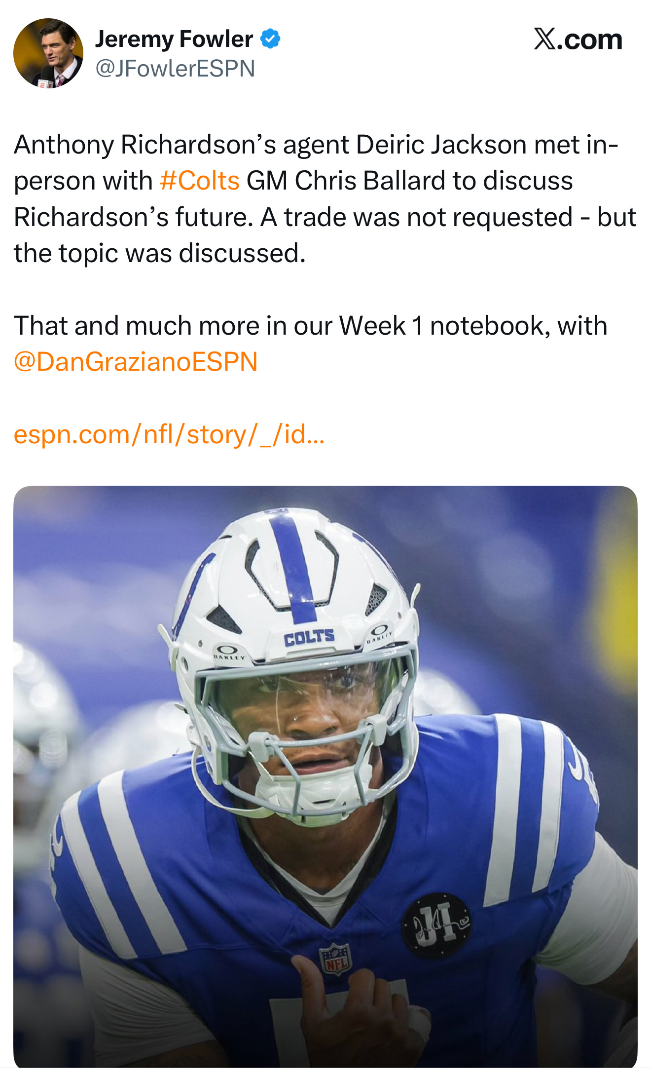 In an article published by ESPN Senior NFL Reporter Jeremy Fowler, he reported that recently, quarterback Anthony Richardson Sr.’s agent, Deiric Jackson of Legacy Sports Advisors, met in person with the Colts GM, Chris Ballard, to discuss Richardson’s future with the team with reports indicating the topic of a possible trade was "broached" by Jackson, although a trade was not requested.