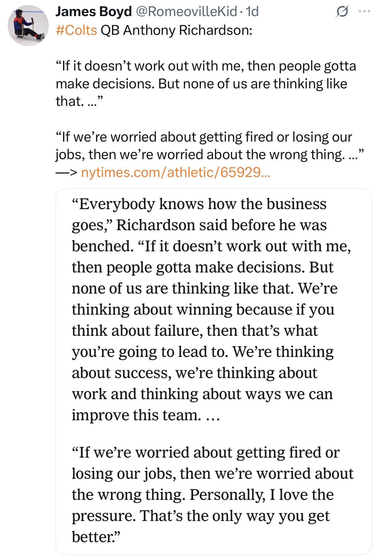 Richardson has acknowledged his leadership shortcomings and has taken steps to become a more mature and vocal presence on the team. He is also realizing he still has another chance to prove himself, as the team has stated that they won’t trade him and reiterated that he’s only one play away from playing. As a fan of Richardson, I am optimistic that when he gets the chance, he demonstrates to the team and the fan base that he has the potential to be the future of the Colts, preventing the team from going through another quarterback carousel.