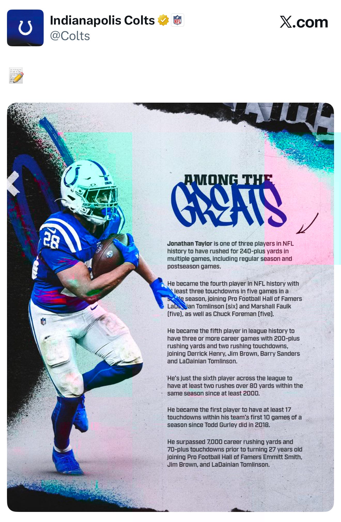 In a back-and-forth battle between the two teams, Colts star running back Jonathan Taylor was nothing short of great. He finished the game with 32 rushes, 244 rushing yards, and three touchdowns. After an 83-yard touchdown run earlier in the fourth quarter to give the Colts a late lead, Taylor scored a touchdown in overtime to seal the victory. Taylor’s historic day resulted in him being named in several record books. He also set a franchise record for the most rushing touchdowns in Colts history (66).
