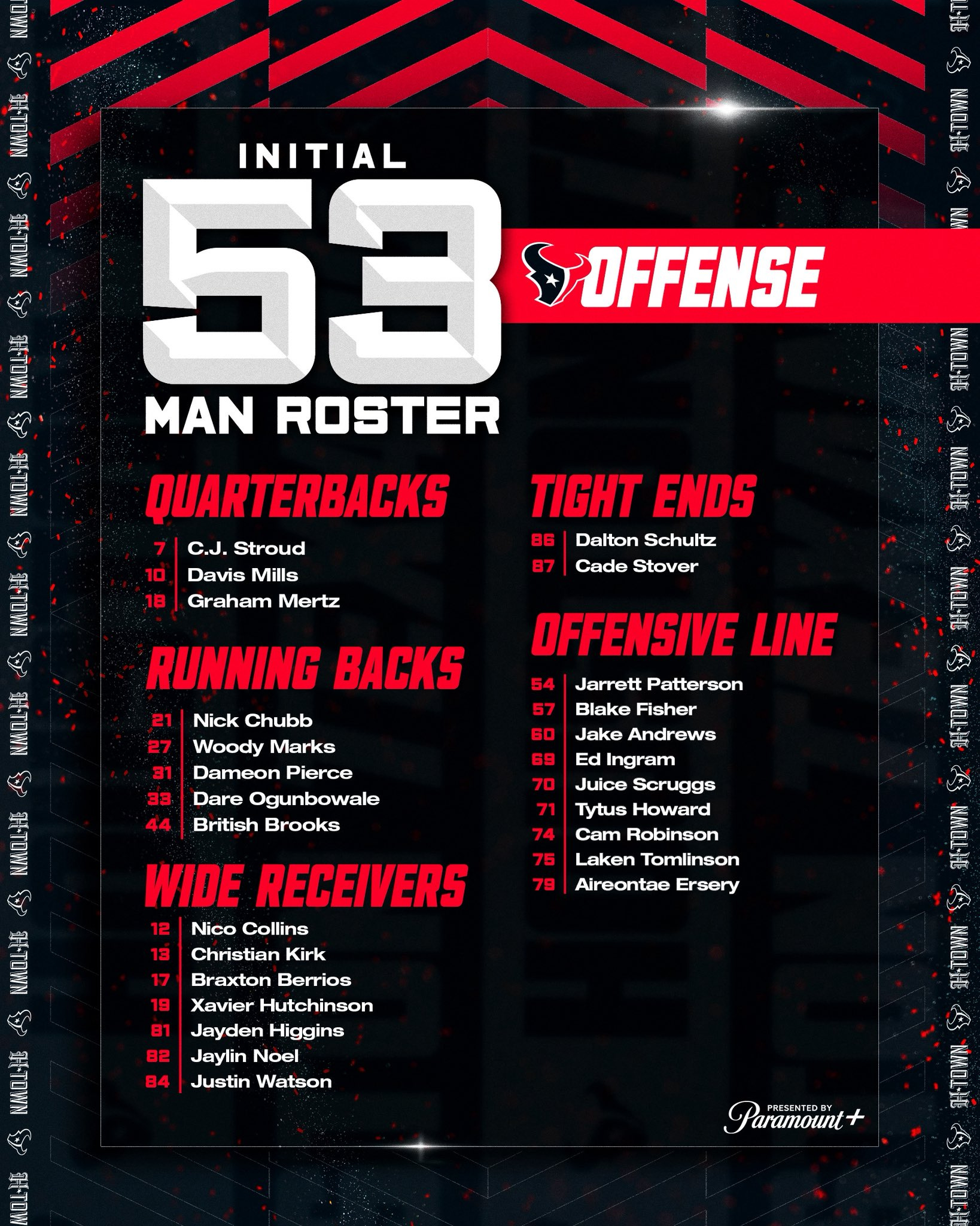 On the offensive side, there were many questions left unanswered from the previous year, such as those regarding the offensive line. With Shaq Mason being cut, Kenyon Green and Laremy Tunsil being traded, the questions grew even larger. Many had ideas about what Nick Caserio was doing after acquiring Trent Brown, Cam Robinson, and Laken Tomlinson in free agency, as well as Ed Ingram from a trade. Still, it seemed to make little impact on fans and experts. Later in the off-season, Caserio also drafted Minnesota tackle Aireontae Ersery, who put on a clinic at the Senior Bowl. Even with the moves, many were still guessing how these additions would work in Nick Caley’s Scheme. As the jury is still out, the preseason did show a glimpse of excitement with a starting line featuring Aireontae Ersery, Ed Ingram, Jake Andrews, Laken Tomlinson, and Tytus Howard, as they allowed only one sack throughout the preseason and allowed the running backs to average 4.7 yards per carry. If this is a glimpse of what is to come, CJ Stroud’s third year should be exciting.
